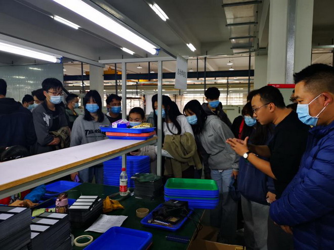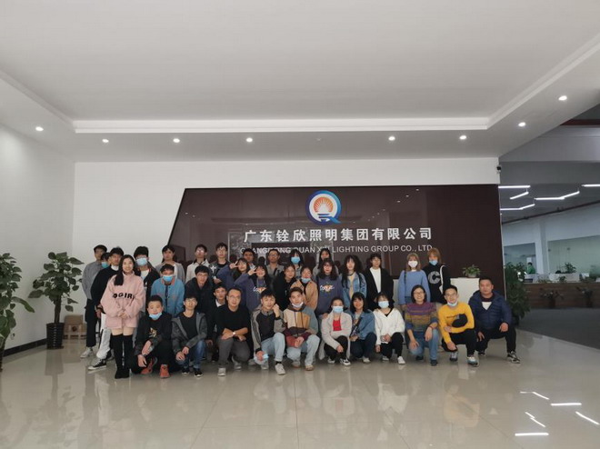 2020年12月25日下午,在尹东晓和赖明两位老师的带领下,2019级光伏工程技术专业学生到达广东铨欣照明集团有限公司。公司领导高度重视,专门派出熟悉公司产品生产流程的研发部主管梁家豪为学生们进行现场教学。