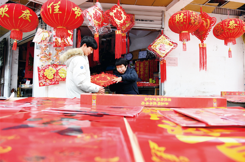 母亲患先天性失明的程保留一家于2014年被确定为建档立卡贫困户。随着脱贫攻坚工作的持续深入,程保留一家享受到当地的健康脱贫、教育脱贫、产业脱贫等脱贫政策。如今,程保留在合肥的一所高校读大二,他多年在外打工的父亲也回乡找到合适的工作。图为2021年1月24日,程保留和母亲一起购买春节用的装饰品。 新华社记者 刘军喜/摄