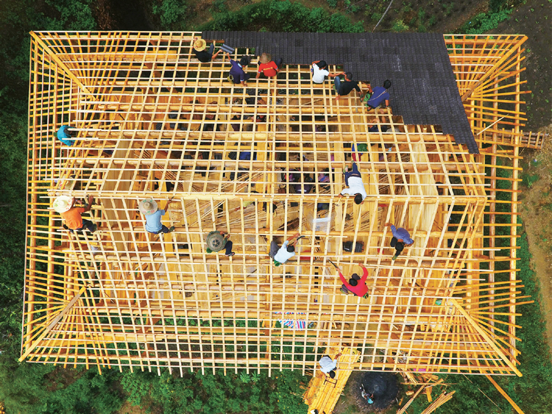 全面小康大家一起走。广东廉江市和广西融水苗族自治县自2017年9月结成对子,开展“携手奔小康”帮扶工作,针对山区群众建房材料运输成本高等实际困难,加大对贫困群众危旧房改造的补助力度,帮助他们实现安居梦。图为2019年9月3日,在黔桂乌英苗寨,群众正在帮助贫困户修建新木楼。 新华社记者 黄孝邦/摄