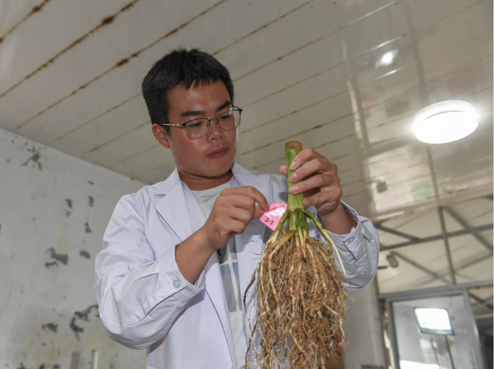 8月2日,沙野在“科技小院”观察玉米根系样本。