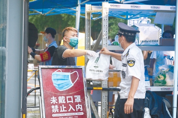 8月5日下午,记者在国风上观小区门口看到,外围拉起了警戒线,小区内装上了两组宽两米、高四层的货架,配送员送来的蔬菜、肉蛋等放在架子上。保安队长丁乃锋的衣服已被汗水浸透,这天,他已经走了6.5万步。
