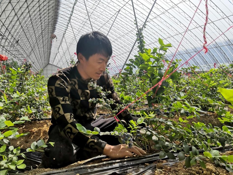 在石桥岗村村集体蓝莓棚里,种植户冯志刚正在查看果实生长情况。当初,他以5.8万元的价格承包了2栋村集体温室大棚,种植草莓和蓝莓,获得了不错的收益。