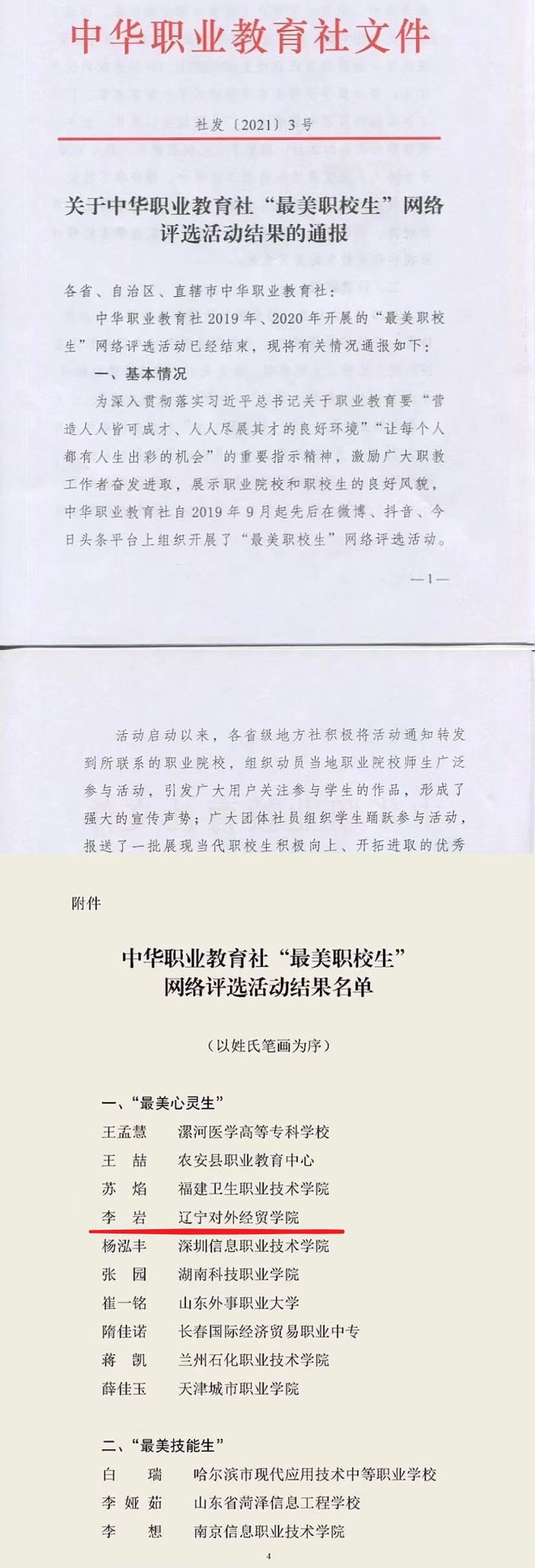 近日,中华职业教育社公布了“最美职校生”网络评选活动的最终结果,我校2019级金融学专业李岩同学荣获“最美心灵生”称号,是辽宁省唯一获奖的学生。