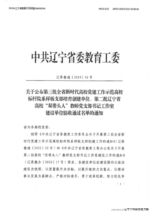 按照《中共辽宁省委教育工作委员会关于开展第三批全省新时代党建工作示范高校标杆院系样板支部创建工作的通知》(辽委教通〔2022〕20号)和《中共辽宁省委教育工委办公室关于开展第二批高校"双带头人"教师党支部书记工作室建设工作的通知》(辽委教办〔2020〕17号)要求,辽宁大学团委党支部在建设期内以政治建设为统领,以质量提升为目标,以提升组织力为重点,以推动共青团事业发展为落脚点,严格对标看齐,勇于改革创新,努力创先争优,在党支部书记的带领下扎实开展培育创建工作,现已顺利通过第三批“辽宁省党建工作样板支部”培育创建单位验收。