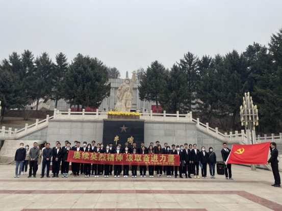 本溪烈士陵园庄严肃穆。全体成员胸前手捧白色菊花,在烈士墓碑前默哀三分钟,寄托着对烈士们的哀思;学生代表车禹葳、张亮为烈士敬献花篮,全体成员依次敬献鲜花,表达了对先烈们的缅怀和敬意。