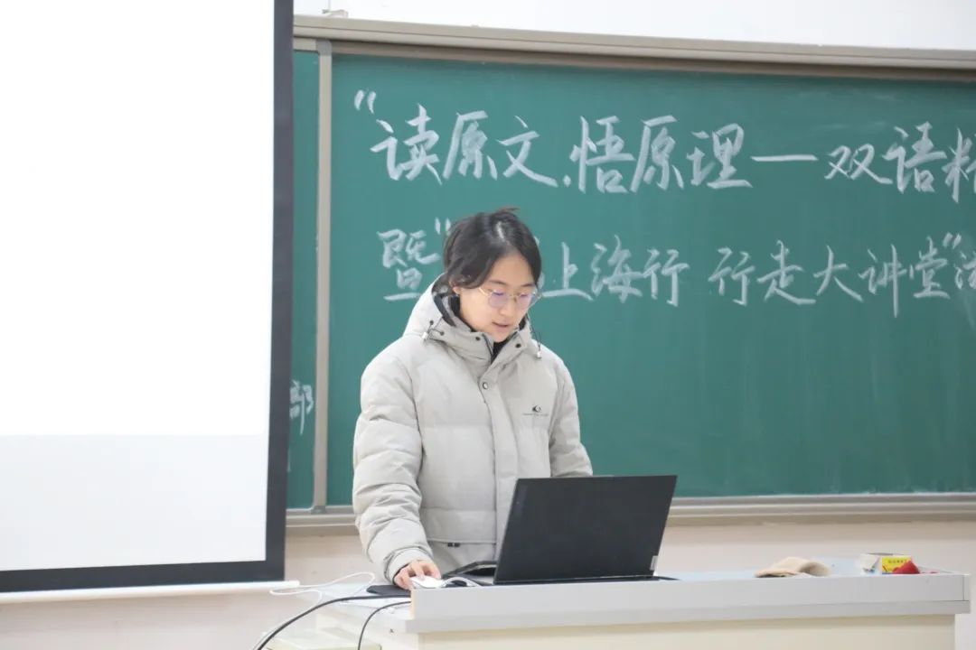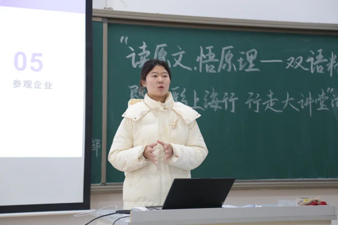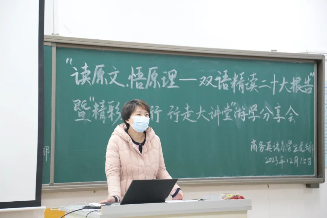 为深入学习贯彻习近平新时代中国特色社会主义思想,12月15日下午,商务英语系学生党支部于B112开展第四期以“读原文,悟原理——双语精读二十大报告”暨“精彩上海行,行走大课堂”游学分享会为主题的系列党日活动。