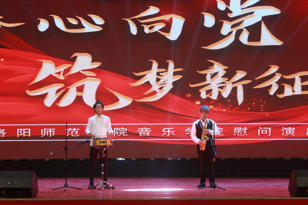 “没有你哪有新中国,没有国哪有万家灯火.....”歌曲《新征程》温暖又激昂的旋律,将人们对党的敬仰与热爱之情娓娓道来,用动人歌声,带人们走进百年前漫漫长夜,又带人们回到百年后的新时代山河壮阔;萨克斯与小军鼓合奏《铁血军魂》,悠扬深情的萨克斯与铿锵有力的小军鼓相得益彰,展现了在中国共产党领导下的人民军队,勇往直前、锐不可当的英雄气概,表达了对中国军人的热情赞美和崇敬之情;古筝合奏《我和我的祖国》婉转深情的旋律,抒发了“我和祖国”唇齿相依的亲密关系,表达了对祖国的热爱与依恋。唢呐独奏《绣金匾》抒发了广大人民群众对革命领袖们的热爱,以及对人民子弟兵的深厚情意。歌伴舞《不忘初心》磅礴大气男声与细腻婉转的女声交融,饱含对新中国繁荣昌盛的祝福,深藏着对中华儿女团结奋进的希冀。