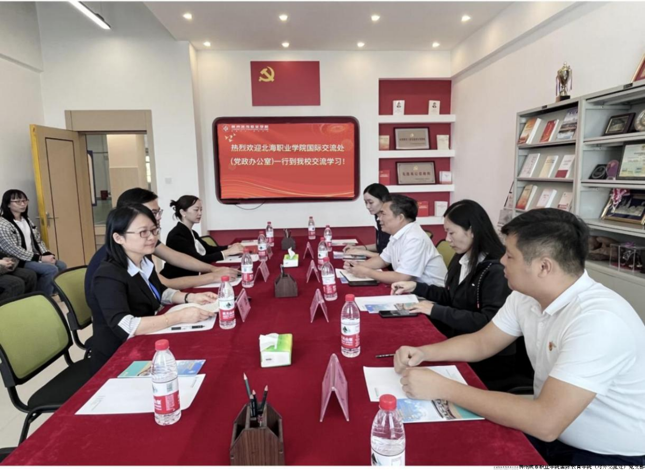 近日,北海职业学院国际交流处和旅游商贸学院党总支的领导和老师们先后莅临我校,与我校国际教育学院(对外交流处)共同探讨党建工作的新思路、新方法,旨在通过党建引领,促进两校教育事业的共同发展。