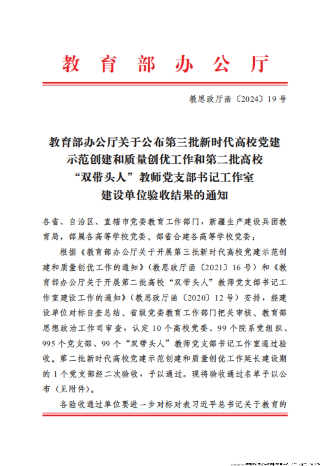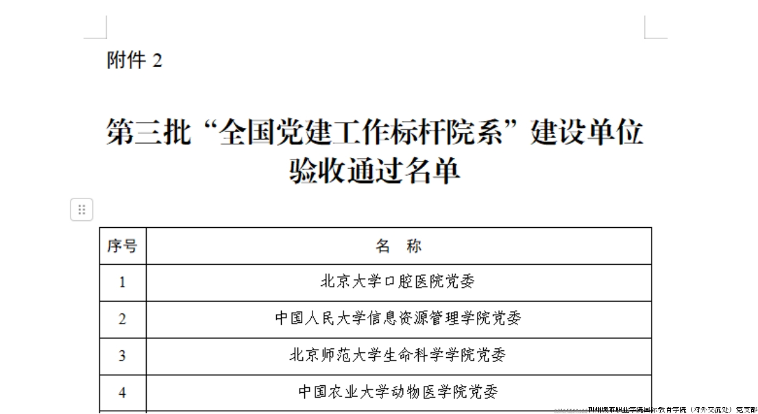 近日,教育部办公厅公布第三批新时代高校党建示范创建和质量创优工作和第二批高校“双带头人”教师党支部书记工作室建设单位验收结果的通知,我校国际教育学院(对外交流处)党支部正式通过第三批“全国党建工作样板支部”培育创建单位验收,充分体现了近年来学校党委狠抓基层党支部标准化、规范化、特色化建设的最新成果,标志着学校基层党建工作迈入一个新台阶、新阶段。