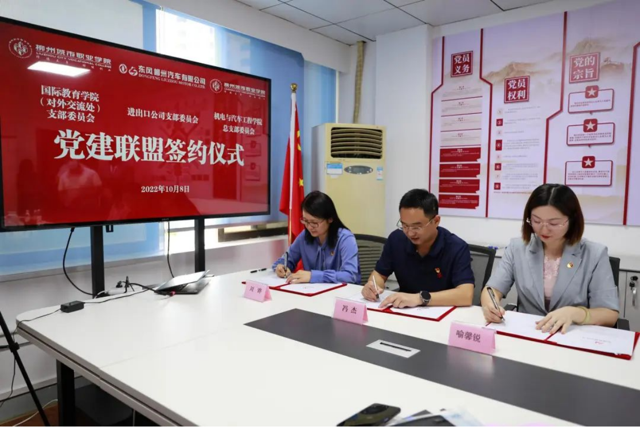 10月8日下午,柳州城市职业学院机电与汽车工程学院党总支、国际教育学院(对外交流处)党支部与东风柳州汽车有限公司进出口公司党支部签约成立党建联盟。此举将进一步加强党对教育工作的全面领导,推动校企融合发展,促进校企之间党建先进理念、经验、做法的合作与交流,提升党组织育人合力,以高质量党建引领保障学校和企业高质量发展。