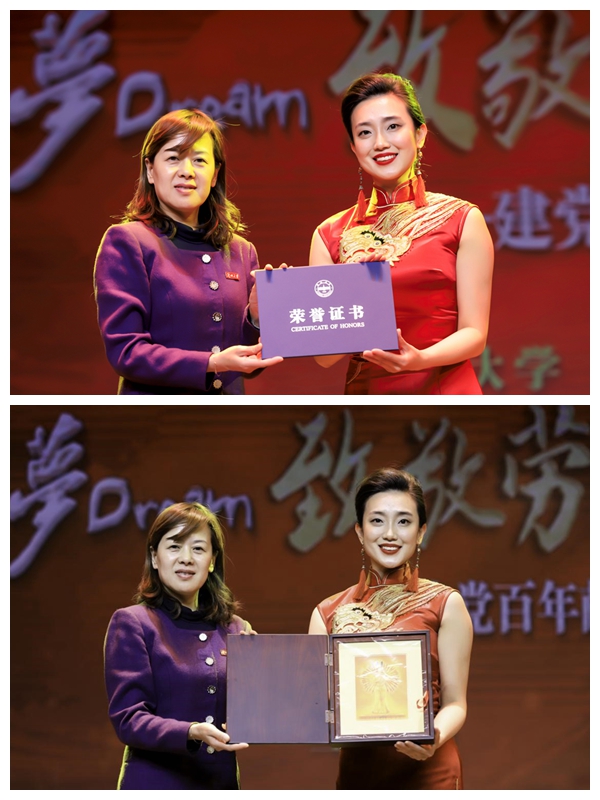当晚,由曹红代表兰州大学为中国残疾人艺术团颁发“兰州大学爱心公益大使”荣誉证书,同时姜馨田老师也代表中国残疾人艺术团赠予兰州大学“千手观音金箔画”。