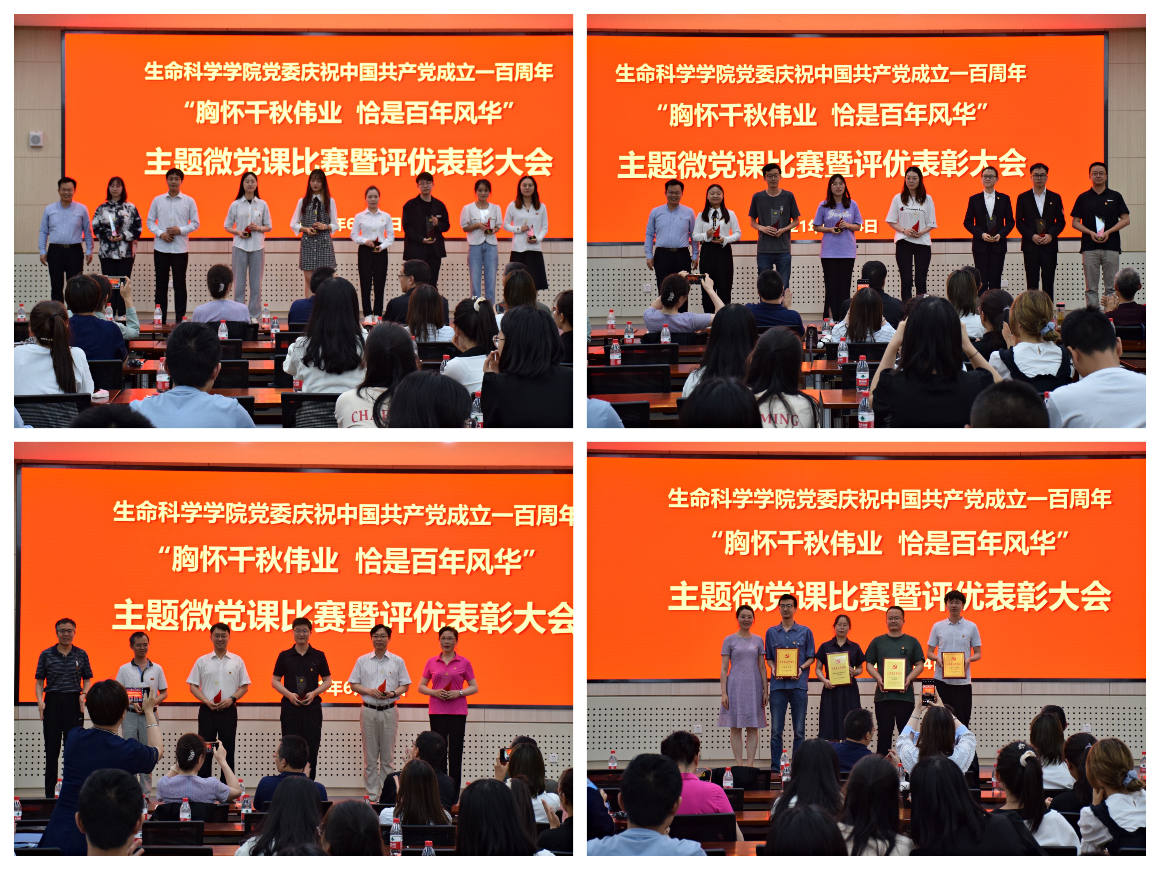 微党课比赛结束后,评优表彰大会隆重举行。在全体与会人员奏唱国歌后,党委委员邓建明副院长、冯虎元副院长分别宣读了《生命科学学院党委关于表彰先进基层党组织、优秀共产党员、优秀党务工作者的决定》《生命科学学院党委关于表彰“胸怀千秋伟业 恰是百年风华”主题微党课比赛获奖人员的决定》。学院党委委员、离退休党员代表为受表彰的19名优秀共产党员、5名优秀党务工作者、4个先进基层党组织,主题微党课比赛获奖选手颁奖。
