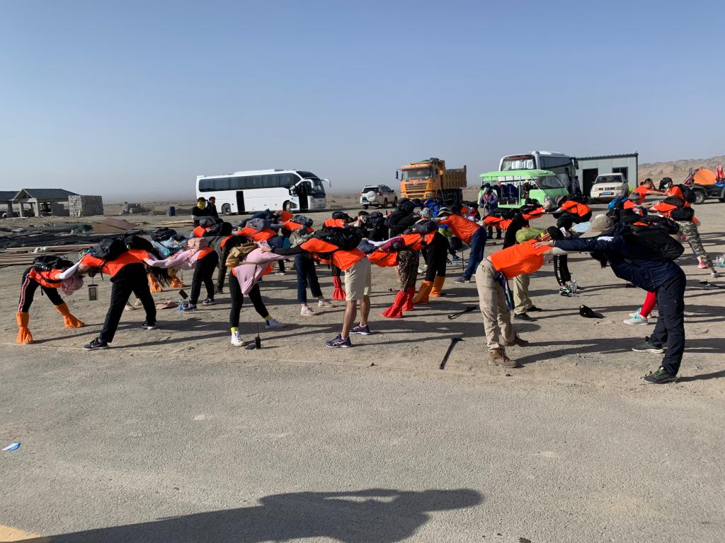 27号一大早,兰州理工大学MBA十周年第三届MBA徒步挑战赛正式开赛。大家聚集在出发点前领取中途的补给物资、整理装备、拉伸放松、合影拍照,点将台前充满底气的加油亮相是对戈壁沙漠最好的敬畏,同学们整装待发!经过随机分组,3人一队,成绩以所有人完赛计入。小组的每一位小伙伴都激动万分,都在暗暗的为自己的队友加油鼓劲!一声发令枪响后,大家欢呼着冲出起始线,奔向未知的路途。