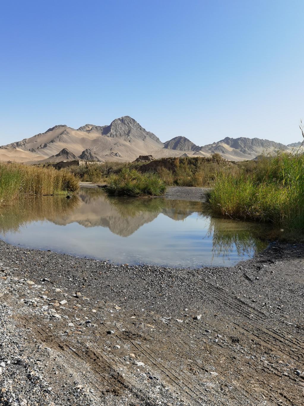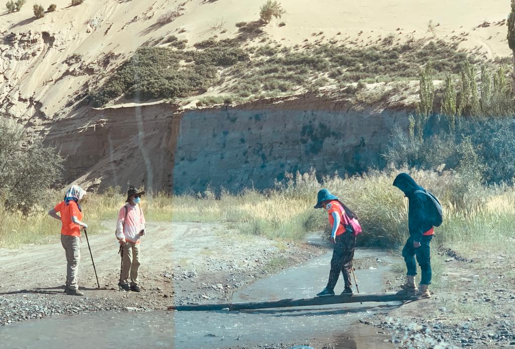 比赛第一天的线路设在楼兰古国南面的多巴沟胡杨峡,这里自然风光奇特,地形地貌多样。同学们一路前行前半程在峡谷中涉溪,远望沙漠、峡谷、雪山,近看胡杨、红柳、芦苇,后半程是一望无际的沙漠和一段艰难的登山路途。大自然碰撞出了最壮丽的景色,深入西北腹地,感知最独特的景色。