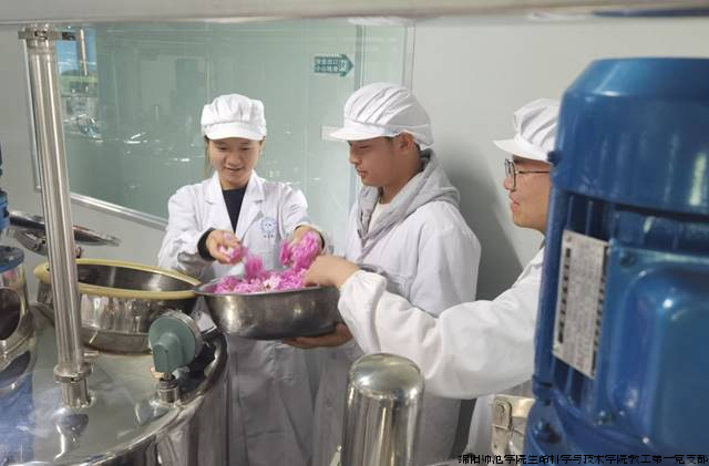 团队成员在四川百善缘实业有限公司酵素研究院实地开展玫瑰酵素研发和生产,将上午在绵阳市安州区玫花漫香种植合作社采摘的新鲜大马士革III玫瑰进行杀菌消毒处理后投入酵素投料口,进行生姜玫瑰酵素的发酵。据悉此工艺制备的玫瑰酵素既有清洁人体血液、提高综合免疫力、辅助消化的功效,也有美容养颜、疏肝解郁的功效,而且本配方还可以充分利用玫瑰鲜花沁人心脾的香味提升此酵素的味觉和嗅觉体验。