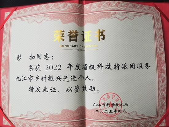 为全面贯彻党的二十大精神,按照习近平总书记关于科技特派员制度的重要指示,坚持人才下沉、科技下乡、服务三农,推动科技特派员等科技创新人才服务乡村振兴的重要作用。4月24日-25日,九江市科技赋能乡村振兴工作现场推进会在修水县召开。会上,九江市科技局有关领导宣读了“关于表彰2022年度省级科技特派员服务乡村振兴先进个人的决定”并进行颁奖,充分肯定他们在服务九江市区赋能乡村振兴建设中发挥的带头作用。