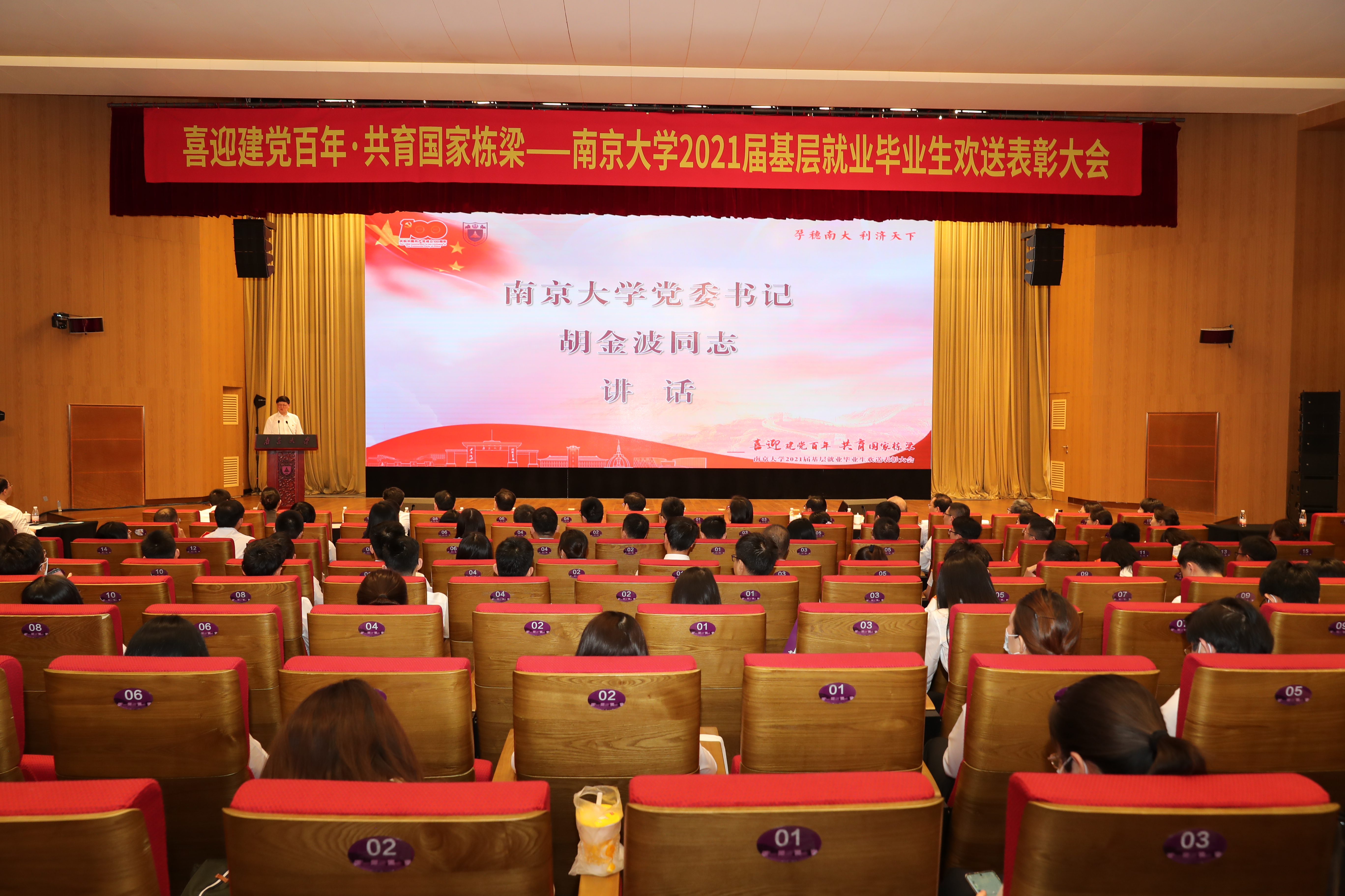 6月6日,"喜迎建党百年·共育国家栋梁——南京大学2021届基层就业毕业生欢送表彰大会"在仙林校区举行。校党委书记胡金波、江苏省委组织部副部长洪浩出席大会并讲话。副校长王志林,党委常委、组织部部长、学生工作部部长龚跃,淮安市委常委、组织部部长孙虎,宿迁市委常委、组织部部长高飞,宿迁市委组织部常务副部长张卫东、省委组织部干部队伍建设规划办公室二级调研员任向东等学校和省、市组织部门领导出席。我校本科生院、党委研究生工作部、团委等部门相关负责同志以及江苏省13个设区市组织部门相关处室负责同志参会。会议由南京大学学生就业指导中心主任葛俊杰主持。