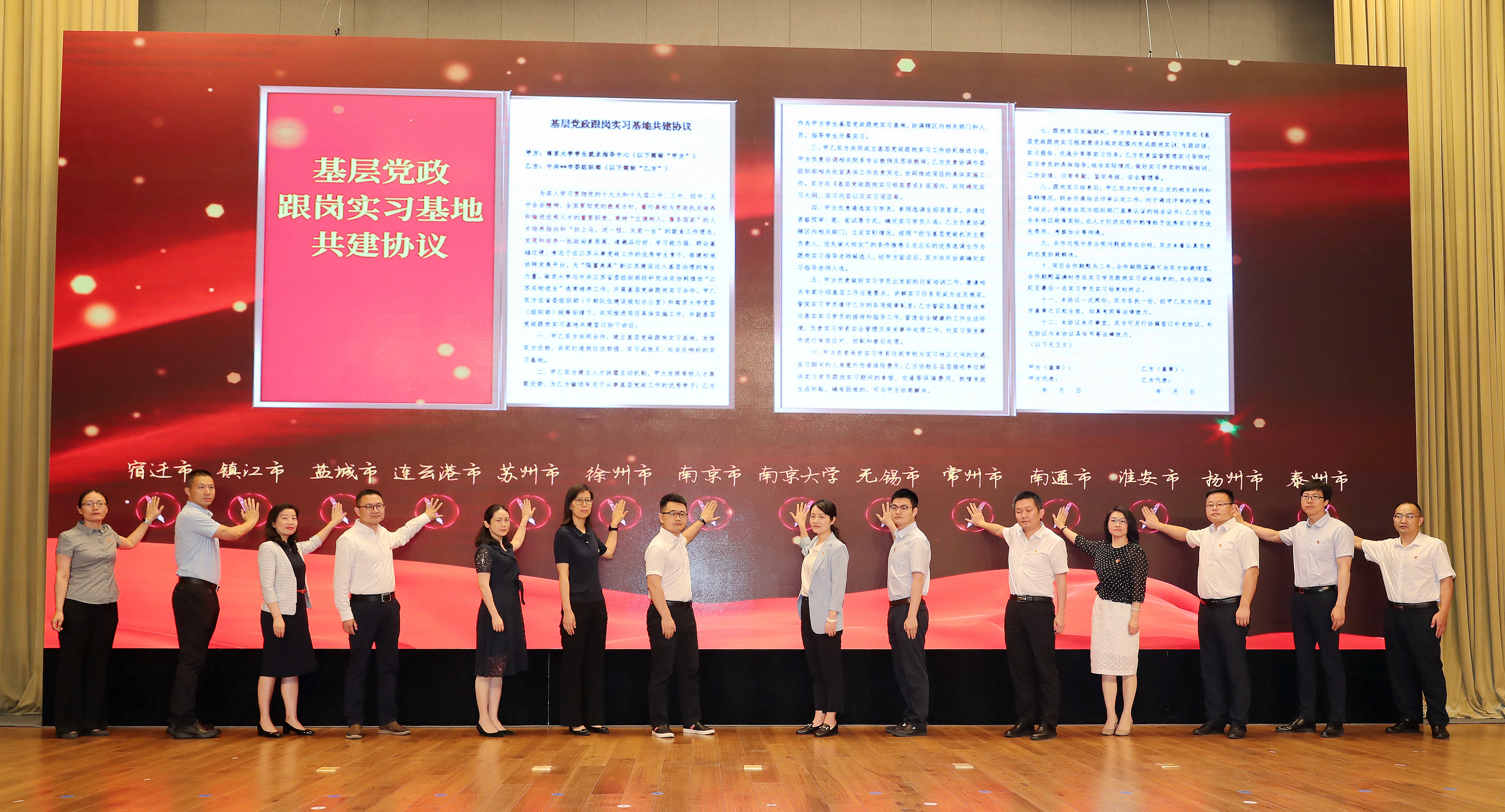 大会共分三个篇章。第一篇章"共助力,同扶上马"围绕基层人才培养主题,以南京大学"六位一体"选调生培养工作回顾视频开篇。学生就业指导中心副主任朱翰墨介绍并发布了"南京大学未来选调生党政跟岗实习暨选调生校友跟踪关怀计划"。学生就业指导中心副主任刘慧与13个地市组织部相关处室负责同志签署"基层党政跟岗实习基地共建协议"。