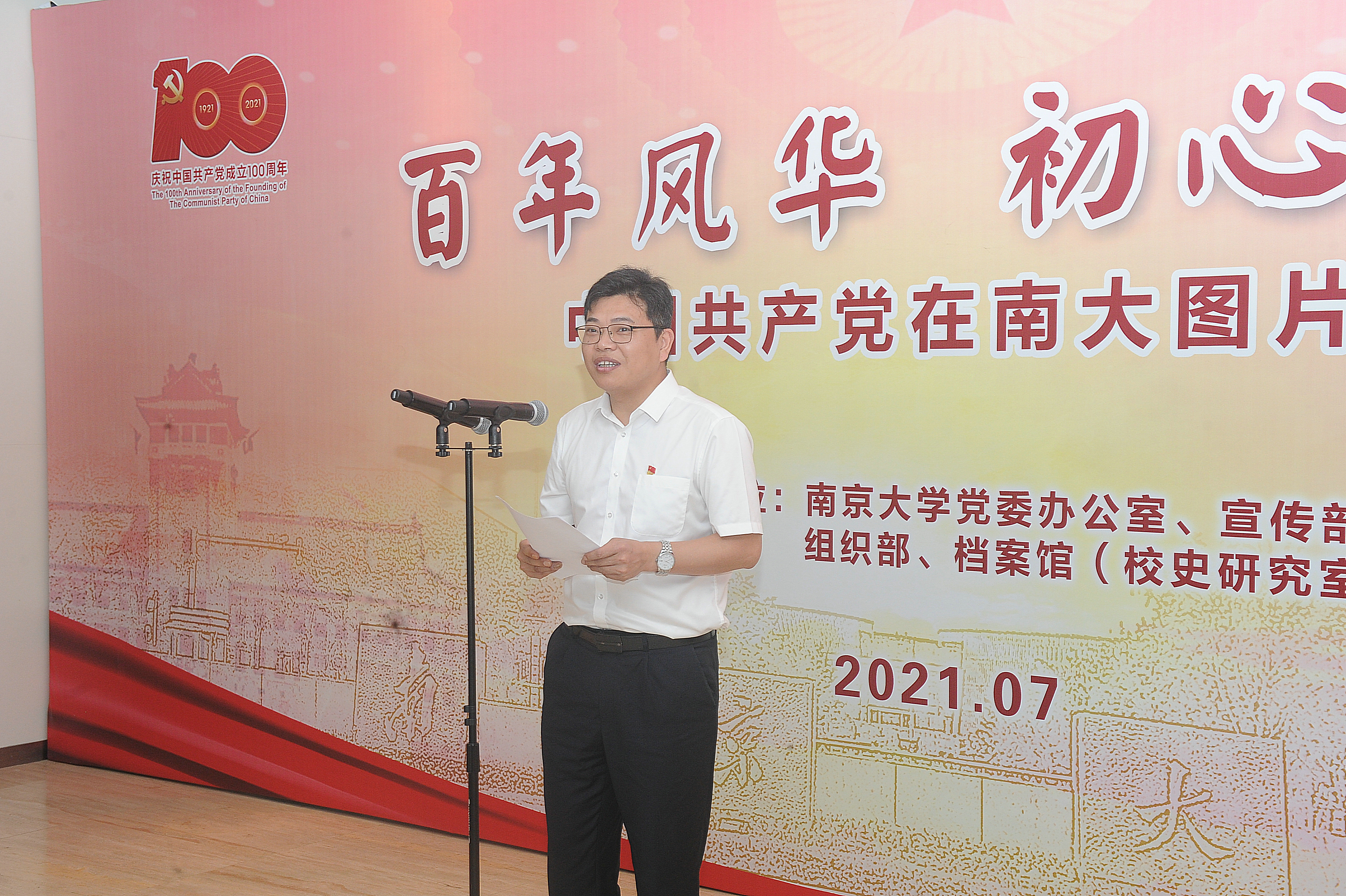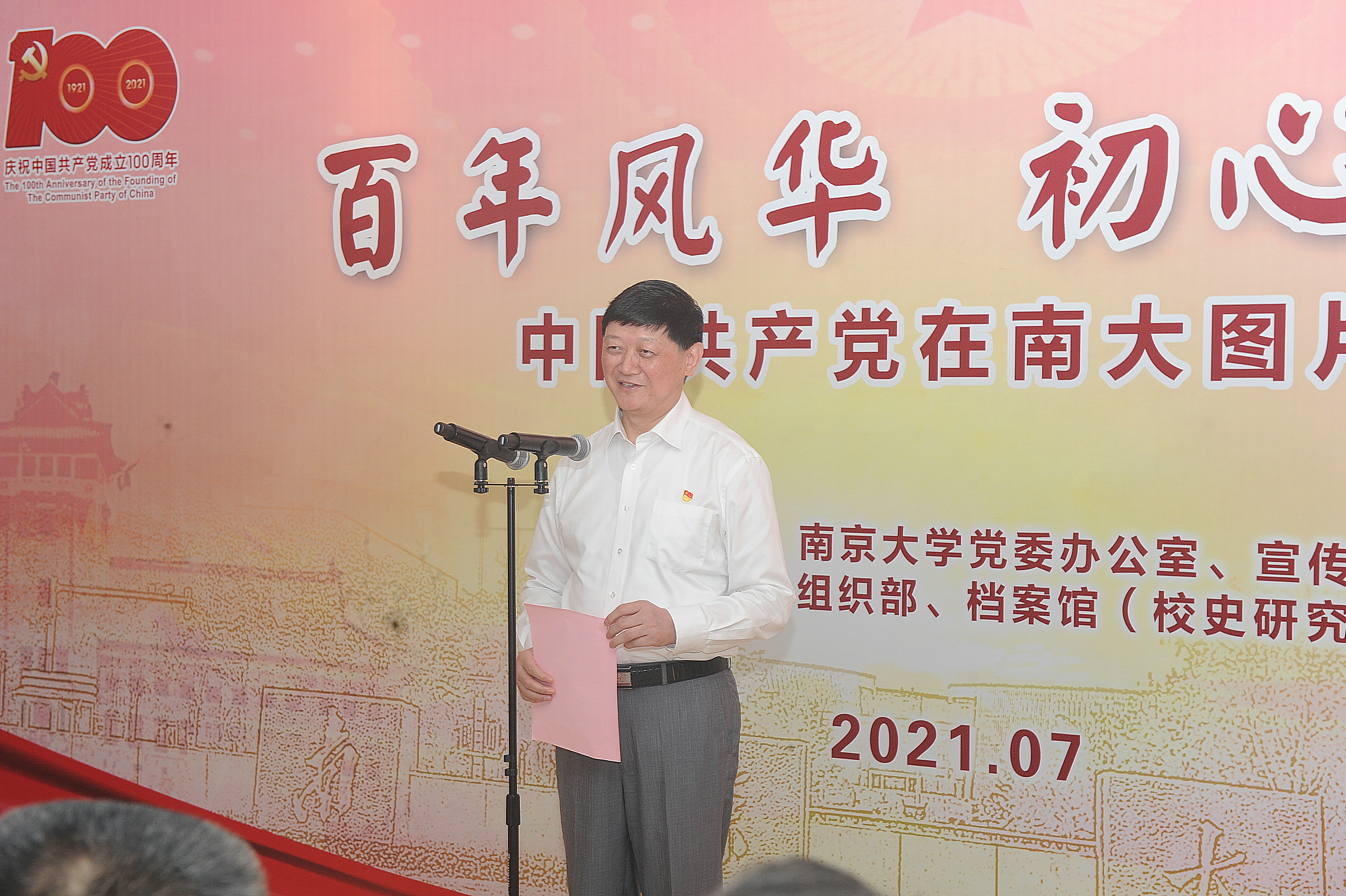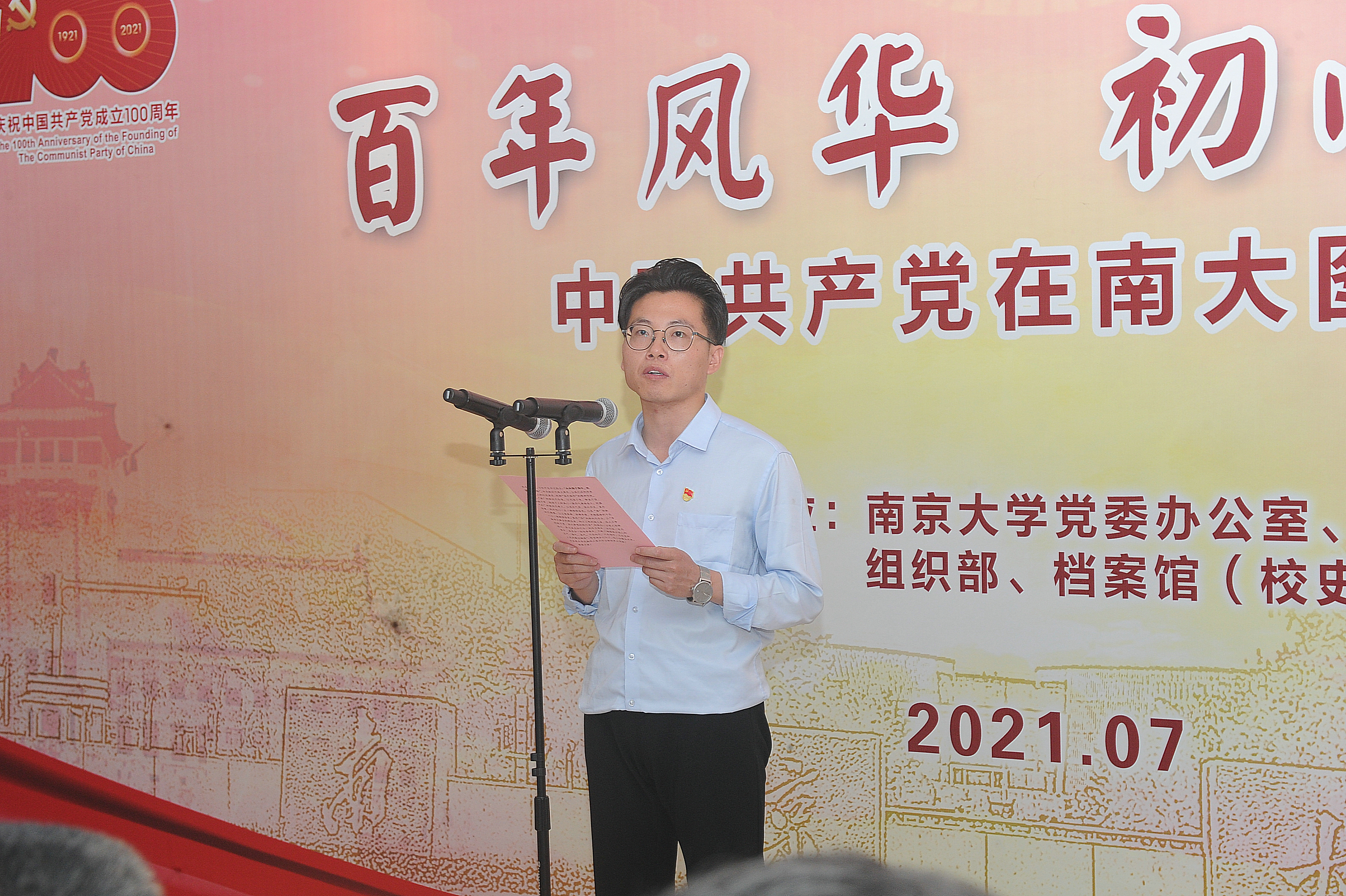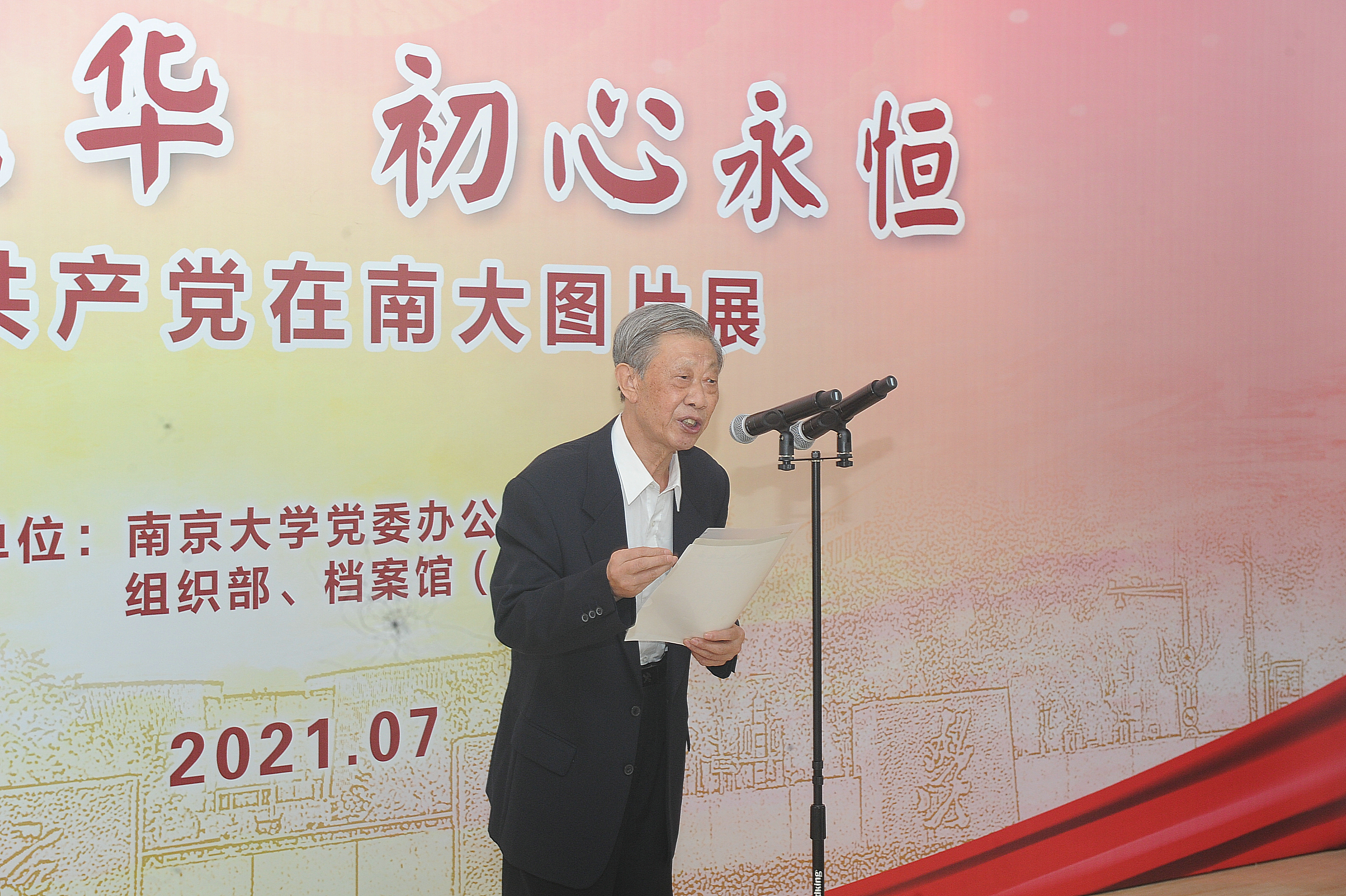 为庆祝中国共产党成立100周年,扎实推进党史学习教育,传承红色基因,赓续红色血脉,7月8日,"百年风华初心永恒——中国共产党在南大图片展"在我校仙林校区开幕。校党委书记胡金波、校长吕建、校原党委书记韩星臣等出席仪式。校党委副书记薛海林主持开幕式。