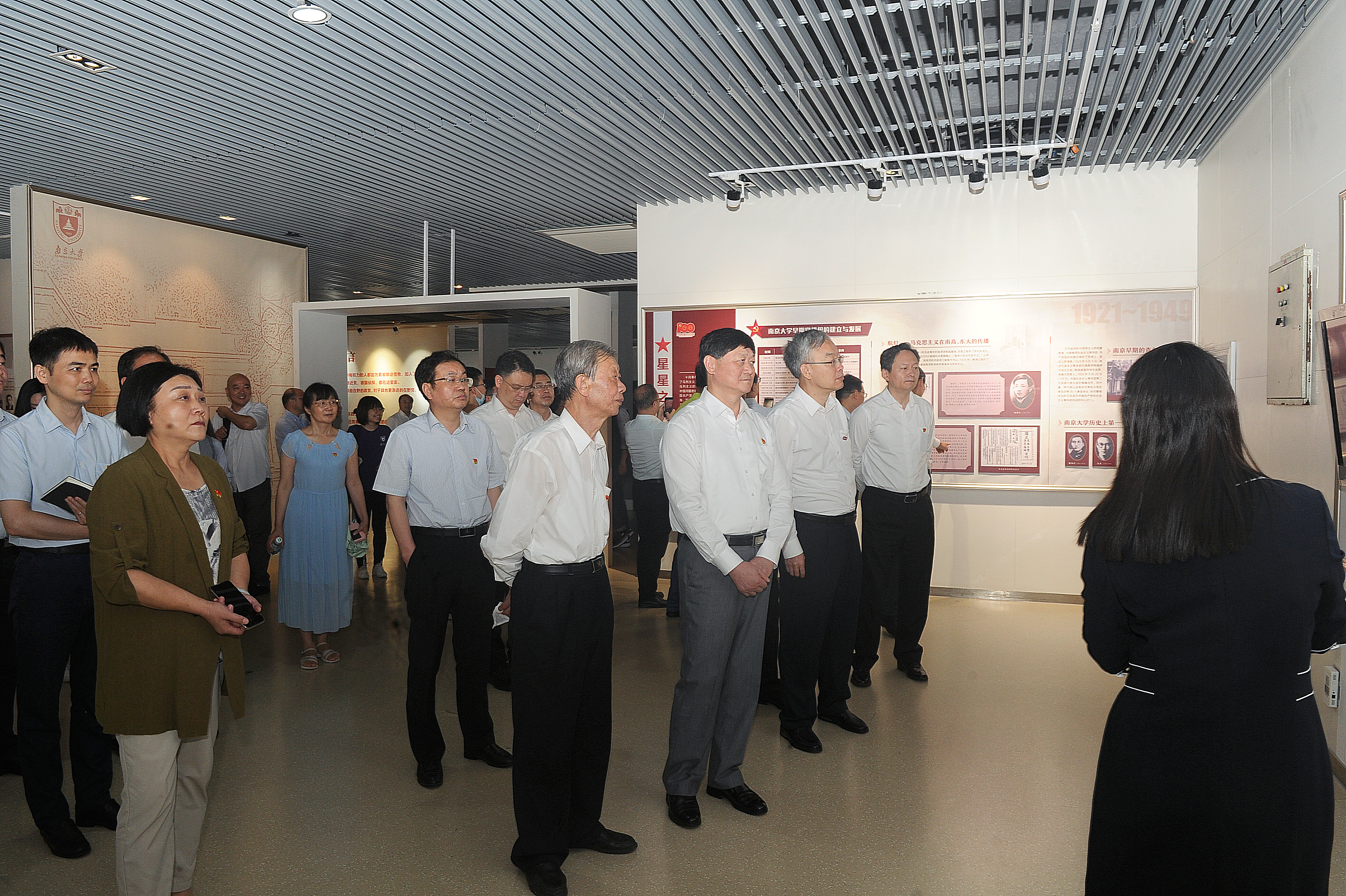 会后,与会领导嘉宾共同参观了图片展。据悉,本次展览由党委办公室、宣传部、组织部、档案馆(校史研究室)共同主办,为南京大学首次利用原始档案资料,全面梳理中国共产党在南京大学的百载历史、总结展陈南京大学的红色历史,共精选档案图片近700张,总展线长160余米。展览共分为"星星之火""曲折前进""改革振兴""继往开来"四部分,以珍贵鲜见的历史档案、泛黄老旧的真实图片,深度挖掘南京大学红色资源,以百载时间为轴,以重大事件为切面,以重要人物为基点,全面了梳理中国共产党在南京大学的百年历史。
