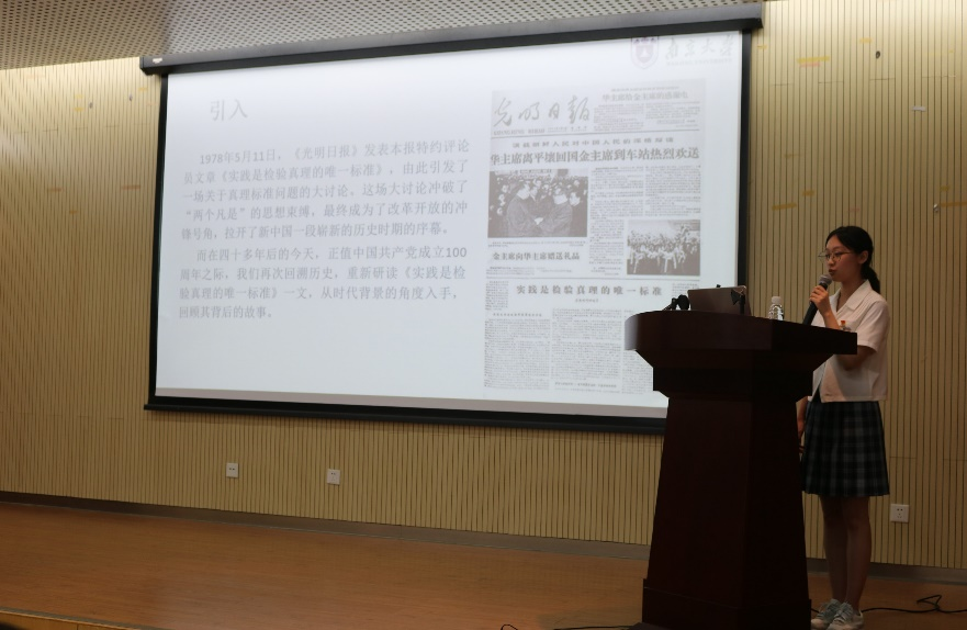 在第三篇章中,两支参赛队伍聚焦南京大学哲学系胡福明教授的改革开放 “思想号角”——《实践是检验真理的唯一标准》一文,讲述了真理背后的故事。本科生党员洪帼一带来微党课“雪尽寒未散,先寄一枝春”,讲述了《实践是检验真理的唯一标准》一文的诞生历程。2019级博士生党支部代表史红继同学则以“变与不变——‘改革先锋’胡福明”为主题讲述了该文主要作者胡福明先生“变”与“不变”的人生。