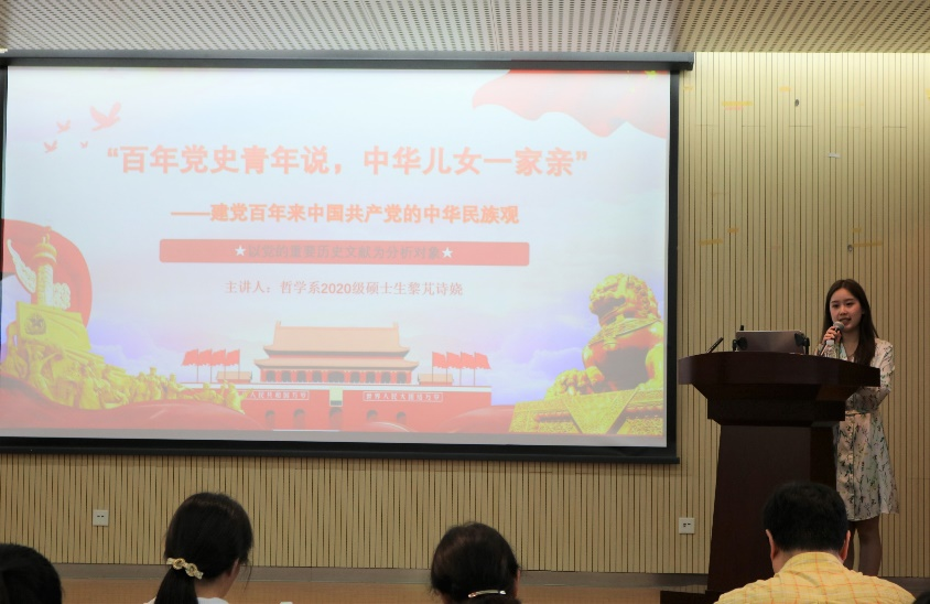 进入第四篇章,2020级硕士生黎芃诗娆以“百年党史青年说,中华儿女一家亲”为题,讲述了中国共产党的中华民族观百年来的变化与发展。2020级博士生党支部代表田笑楠同学讲述“红色南京的百年记忆”微党课,带现场观众一同寻访南京“红色家底”、见证南京百年来的奋斗与变迁。