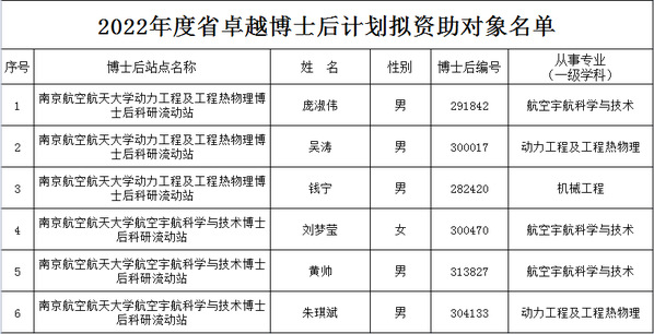 日前,江苏省人力资源和社会保障厅公布了2022年度江苏省卓越博士后计划拟资助名单。我院6名博士后通过单位推荐的方式申请,