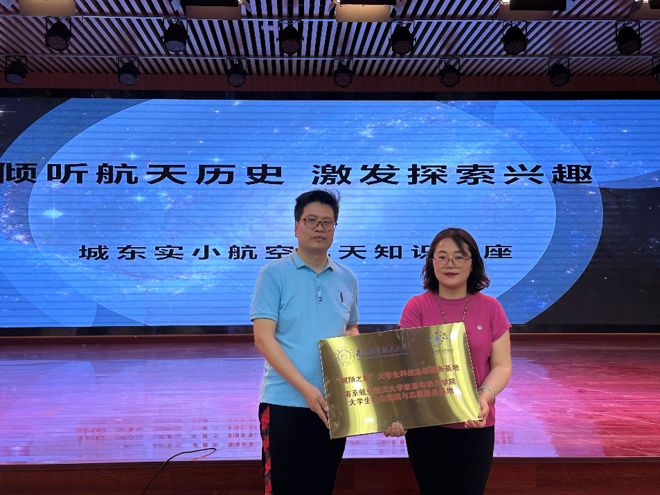 下午,“翱翔之翼”科技志愿服务团队在城东实验小学报告厅举行科学家精神宣讲和航空航天知识科普讲座。樊小杰在致辞中向全体学生提出倡议和要求,希望大家立大志、明大德、成大才、担大任,从小树立勇于探索的精神。樊茜和樊小杰共同为“翱翔之翼”大学生科技志愿服务基地暨能源与动力学院大学生社会实践和志愿服务基地揭牌。