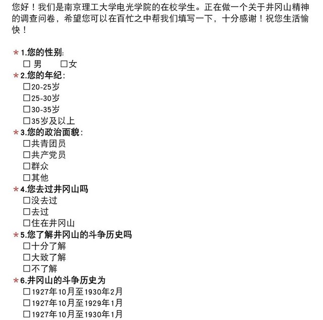 研学团队开展了“红色精神云调研——井冈山精神调研”活动。前期,研学团队经过多次研讨,确定了调研问卷的具体内容,针对不同年龄层次人群,调研其对井冈山历史与井冈山精神的了解程度等。后期,研学团队对问卷进行了整理与分析,形成了调研报告。