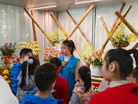 在掌握兰花知识的基础上,讲解员向小朋友们传授作为优秀讲解员必备的解说技巧。首先,讲解志愿者通过“一位优秀的解说员有哪些特点?”这一问题,充分激发小朋友们的兴趣,小朋友们积极互动,各抒己见。接着,讲解员分享了一个解说口诀——“身正行直,三到合一”,并一一为小朋友们做讲解示范。然后,讲解员向小朋友们提出了一个问题:“三到是哪三到?”小朋友们积极参与回答,讲解员肯定他们的回答并依次为它们介绍“眼到、口到、手到”的具体动作要求,小朋友们在这一部分的学习之后,对一位优秀的讲解员有了更加清晰明确的认识。