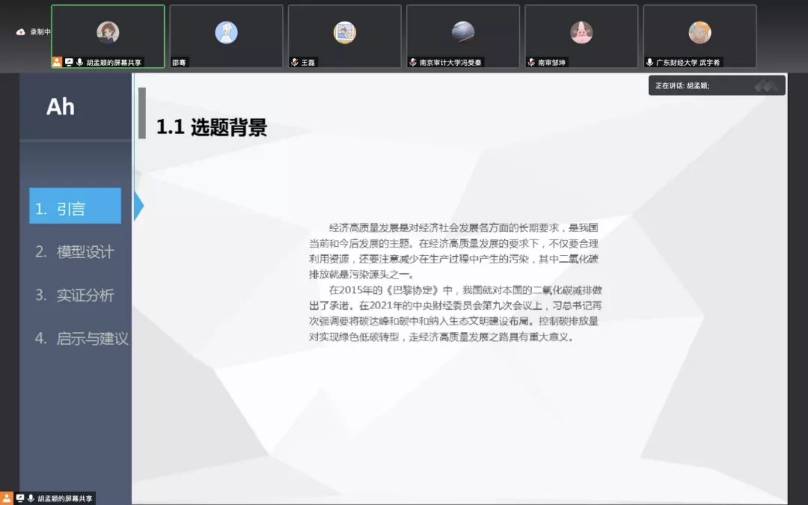 胡孟颖、冯受秦、邹坤和武宇希四位同学就经济、金融领域中的重要研究方向以论文讲述的方式向大家进行主题汇报。