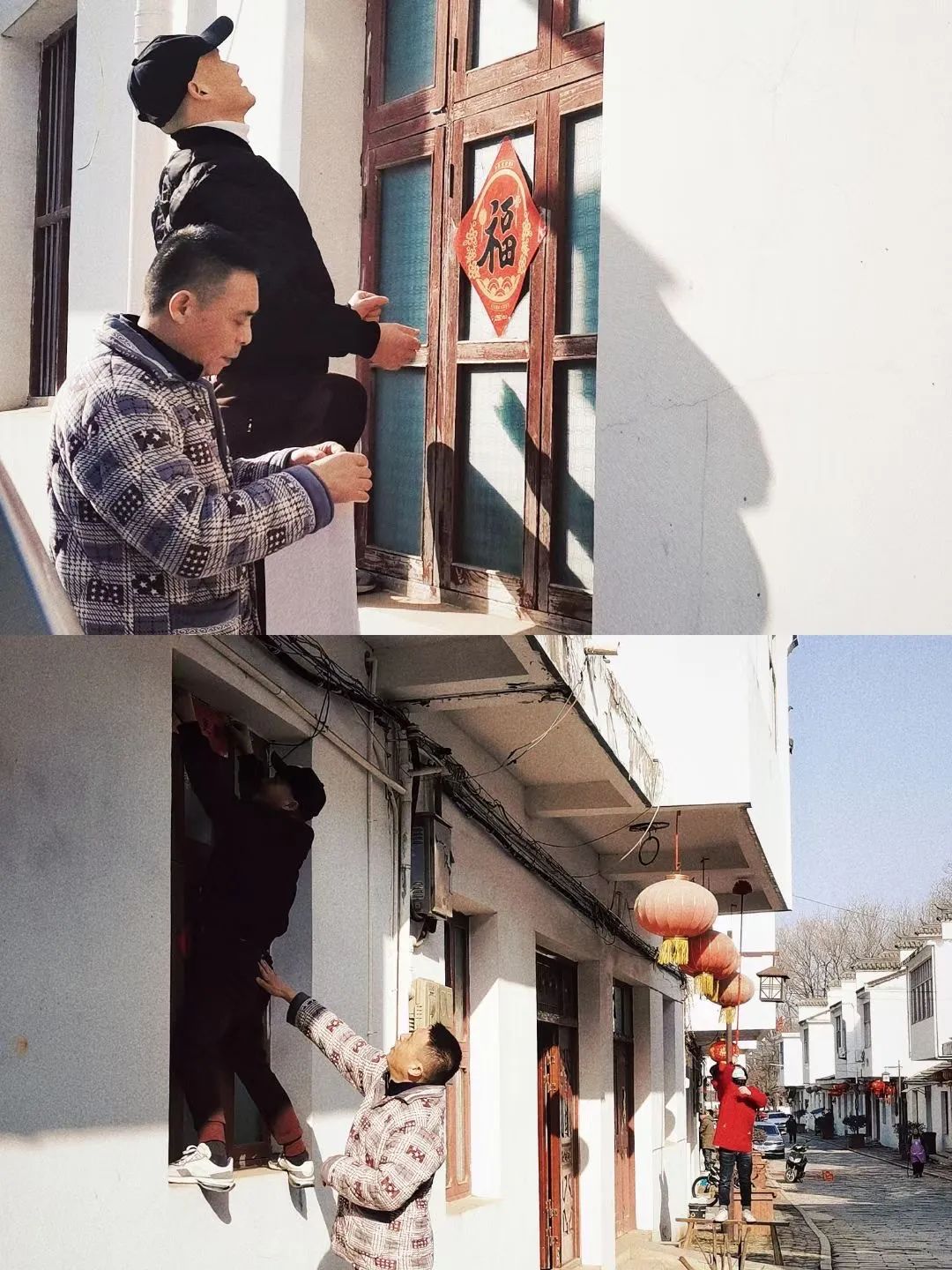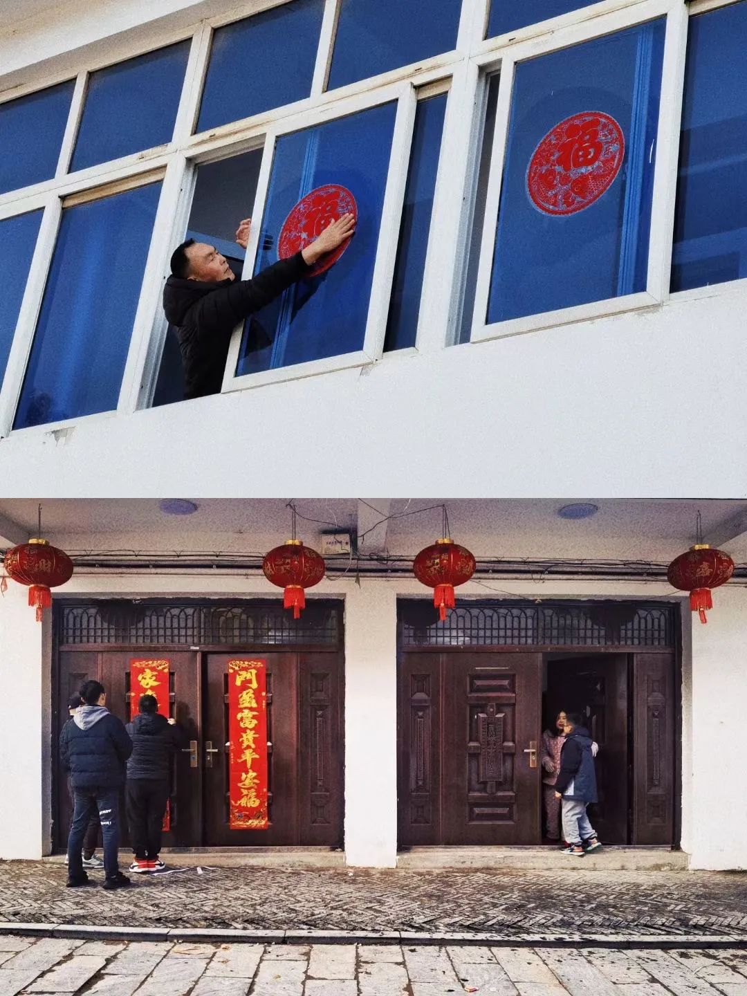 这两组张片拍摄于大年三十的清晨,我的舅舅们纷纷早起为新年的到来做足准备,当这些红红火火的春联一对对的被贴上、红灯笼高高挂起,小小村庄的人们穿着睡衣便开始劳作。每家每户门前都映照着一片鲜艳的红色,蕴含着我们对新一年的美好期望。