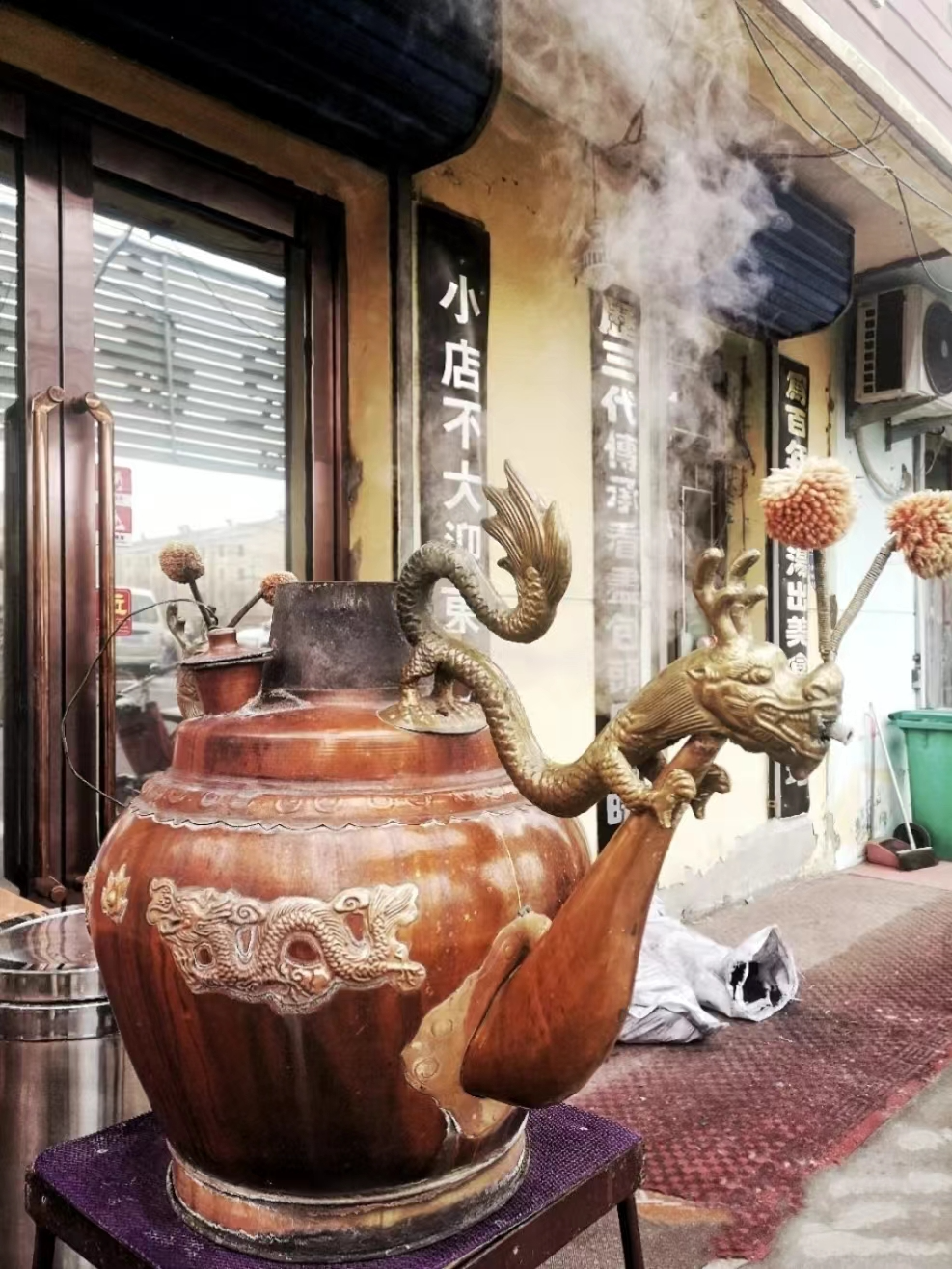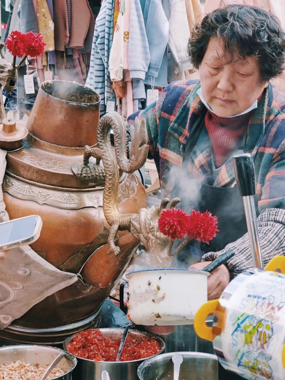 这是老包头的特色—茶汤,是包头的非物质文化遗产。在天寒地冻来上一碗就让人忘不了。各种干果和果脯混着稠稠的高粱米面糊,街边的龙嘴大铜壶现场冲泡。在正月初一的传统庙会上,周边就会有它的身影,它早已经成为了春节的一个特殊味道了。