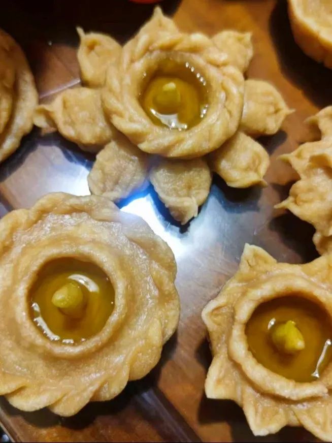 上图是面灯的制作,这是我妈妈小时候的风俗习惯,需要现打好的豆面揉成面团,再通过巧手捏成龙、花、兔子等形状,并留有盛放豆油的小口。做好这些就可以上锅蒸熟,再插上用牙签固定的棉花作为引线,倒满金黄的豆油,放在家中各处再点燃。