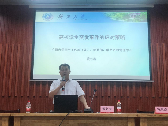 黄必春副教授作《高校学生突发事件的应对策略》专题讲座,讲座由学生工作部部长陈贵虎主持。