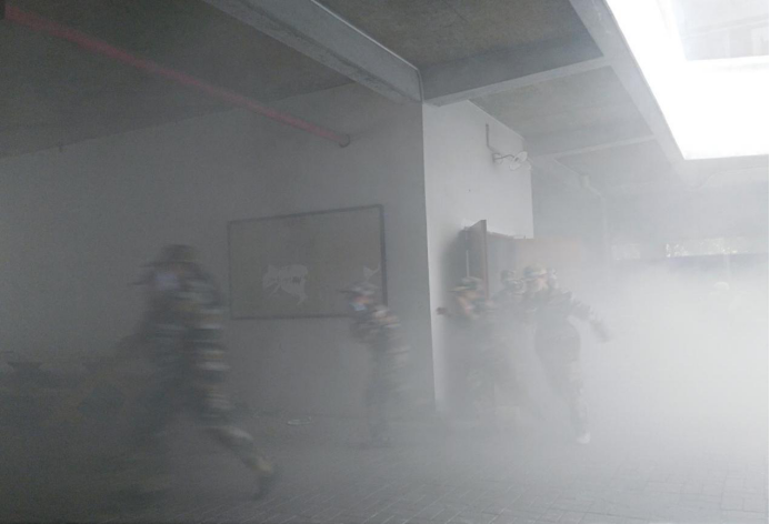 军训教官为新生讲授了火灾现场如何正确报警和自救逃生的知识,示范了如何使用干粉灭火器、如何扑救初期火灾的方法。在14栋宿舍楼开展火灾现场逃生演练中,新生用毛巾捂住口鼻,迅速有序地从烟雾弥漫的宿舍楼撤离,最终全部安全撤到田径场。学校综治办罗军主任针对此次消防演练做了动员,希望学生以演练为契机加强消防安全意识,提高自身应对突发消防事故的能力。