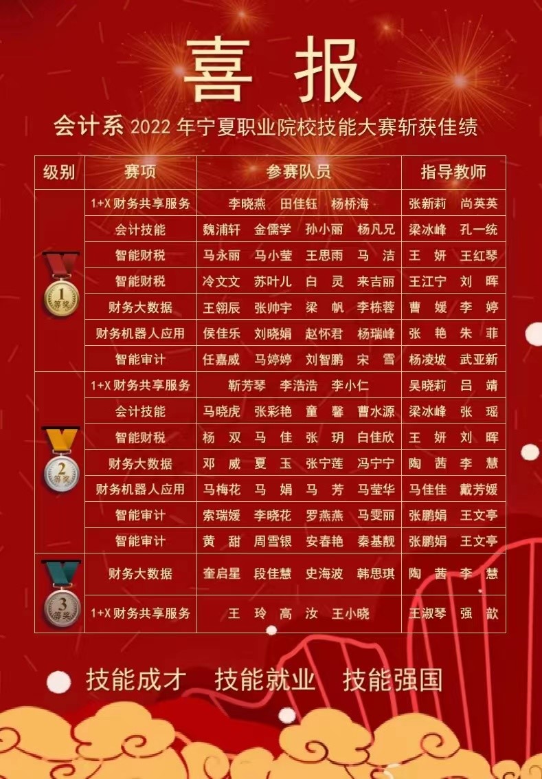 历经5天的激烈角逐,会计系师生不负众望,16支参赛队伍获奖,获奖率达89%,其中斩获一等奖7名、二等奖7名、三等奖2名,优秀指导教师23名,取得了会计系参加技能大赛的历史最好成绩。