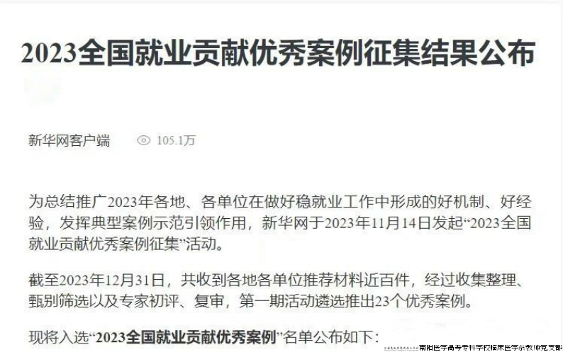 近日,2023年全国就业贡献优秀案例征集结果公布,南阳医专临床医学系“推进医学定向培养 助力基层医疗发展”就业工作案例榜上有名。此项活动由新华网发起,全国推荐材料近百件,经过初评、复审,共遴选推出23个优秀案例。