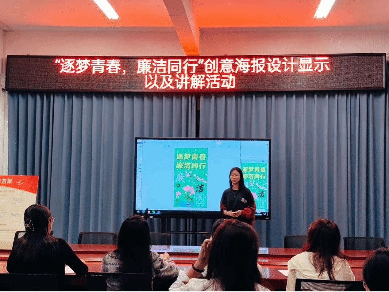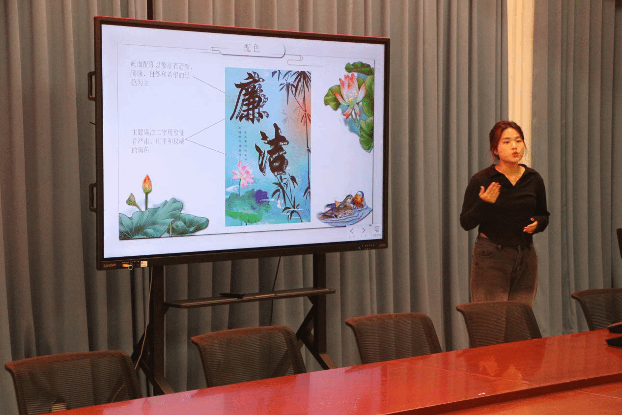 在此次参赛中,参赛者紧扣“青春逐梦,廉洁同行”的主题,声情并茂地讲述自己海报的创作理念。一些同学从家喻户晓的廉洁故事中找到灵感,绘声绘色地阐述了对廉洁的深刻认识;一些同学则以“鹤”为元素,暗示廉洁有志者如鹤,一举扶摇直上天,凌霄翱翔万里远;大部分同学以莲花和青竹为意象,赞扬了君子好“廉”的高尚品格……传达着新时代青年始终保持清正廉洁、勇担时代使命的坚定信念和决心。选手们精彩的表现,赢得现场观众阵阵热烈的掌声。