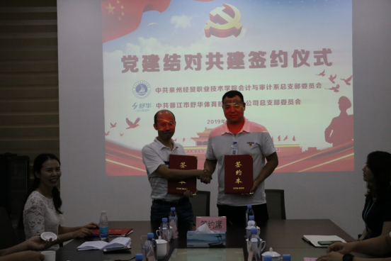 金秋十月,硕果飘香,在这个收获的美好时节,2019年10月12日,会审系党总支与舒华体育股份有限公司党总支党建结对共建合作签约仪式及联合主题党日活动在舒华体育股份有限公司泉州台商投资区分公司顺利开展。学院党委书记周文心,会审系与舒华体育股份有限公司党政领导、学院党工部王婕鹏科长、双方党支部书记以及全体党员共同参加此次活动。签约仪式由舒华体育股份有限公司副总裁、党总支书记黄世雄主持。