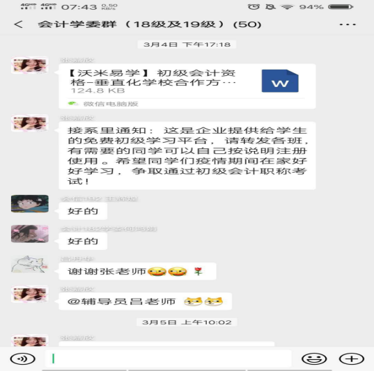 课程还融入了思政教育。做法一,在录制的视频中,结合知识点进行职业道德教育;做法二,每堂课推送一个抗疫新闻,关注时事,弘扬正能量;做法三,协助学生使用各种信息化手段和线上平台,增强学生的学习信念,给与初级会计职称考试的学习资料让其完成计划,转移注意力。