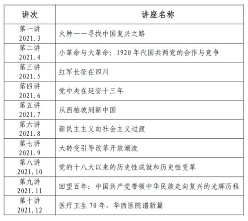 “‘医’心‘医’意学党史,喜迎建党100年”党史学习教育专题讲座是院党委为切实开展好党史学习教育,引导广大党员干部从党的百年伟大奋斗历程中汲取继续前进的智慧和力量,与四川大学全国干部培训基地联合开设的“追光计划”中的专题。系列讲座将从3月开始,每月邀请一位国内著名党史专家为全院党员干部进行专题授课,全年共计十讲,全院各党总支、党支部和广大党员可自行预约参加。
