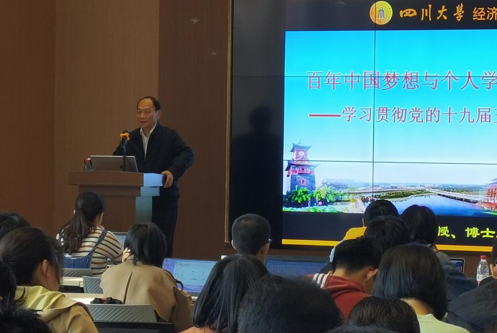 为深入学习宣传贯彻党的十九届五中全会精神,把全省党员干部的思想和行动统一到党的十九届五中全会精神上来,四川省委和四川大学党委先后成立了“学习贯彻党的十九届五中全会精神宣讲团”,深入开展全省、全校专题宣讲活动。我支部蒋永穆、蒋和胜、徐海鑫三位教授入选四川省委宣讲团,姚树荣教授入选四川大学宣讲团。从11月中旬开始,宣讲团成员们按照四川省委、校党委统一部署,紧密结合自身工作实际和研究领域,积极深入各地市、州、区县和各大国资国企、高校,广泛开展了多场专题宣讲报告,引起热烈反响。