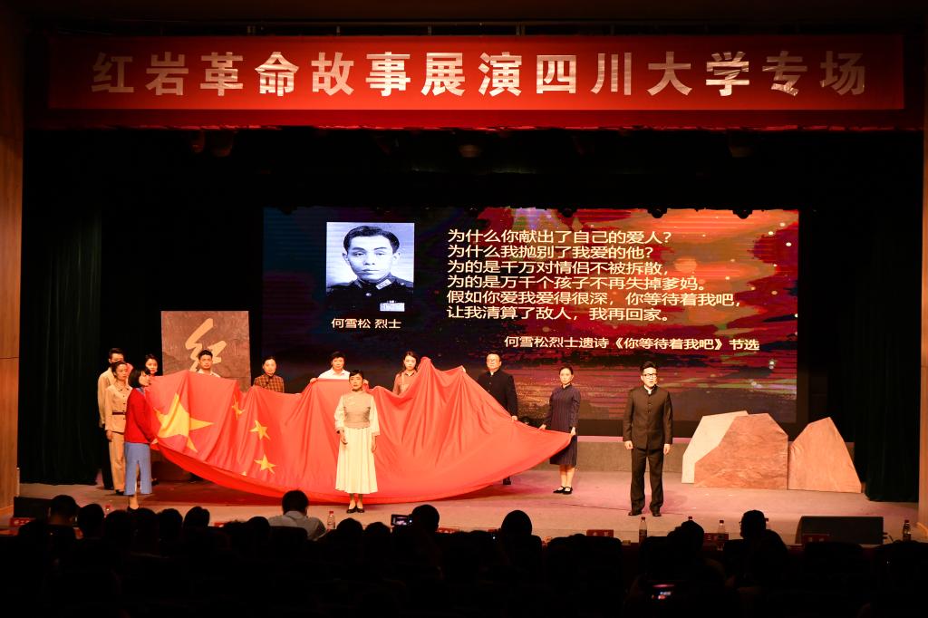 曹萍在讲话中向各位领导和演出人员表示欢迎,向对学校建设发展给予关心支持的重庆红岩革命历史博物馆表示感谢。她指出,四川大学有着悠久的红色历史和光荣的革命传统,历来是“四川进步势力的大本营”和“西南一带传播革命种子的园地”,更是马克思主义在中国早期传播的发源地之一。学校培养和涌现出了一大批救国救民、振兴中华的仁人志士,先后有70多位校友为新中国建立英勇牺牲,其中就有江竹筠、马秀英、李慧明等10位红岩英烈。她强调,近年来,学校深挖“江姐精神”的革命内涵及育人作用,形成了以“江姐馆”“江姐剧”“江姐班”为重要标志的一系列红色文化育人成果。党史学习教育开展以来,学校全力打造“中国共产党在川大”红色教育品牌,多形式、全视角唱响党史学习教育“红色旋律”。学校邀请“红岩革命故事展演”剧组来校演出,是思想政治理论课改革的一次重要尝试。希望同学们通过红岩革命故事展演,学习革命先辈矢志不渝的崇高理想、百折不挠的革命斗志、视死如归的献身精神,争做又红又专时代新人。