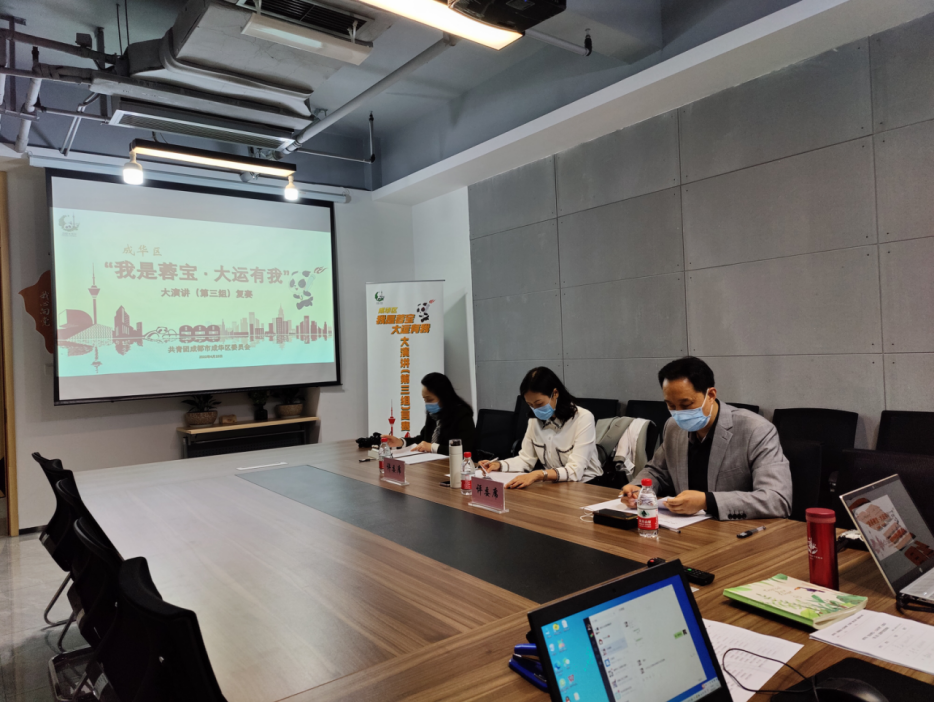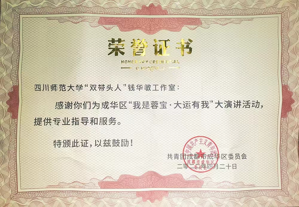 2022年4月,通过工作室邀请到四川师范大学美术类、播音主持类、文学类专家共同参与到成华区“我是蓉宝·大运有我”大演讲活动,为演讲活动提供了各方面专业评审等相关技术指导,现场严谨有序,同时志愿者进行现场工作协助,为活动的圆满结束给予了重要支持,同时工作室也获得了主办方的肯定,共青团成都市成华区委员会颁发荣誉证书以兹鼓励。