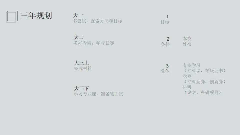 最后学姐为同学们提供了一个三年规划,大家可以将其作为学业规划的参考