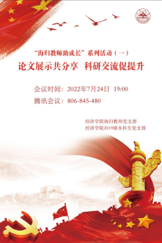 2022年7月24日晚,山东大学经济学院海归教师党支部与2019级本科生党支部在线上举行“论文展示共分享,科研交流促提升”海归教师助成长活动。本次活动旨在分享优秀同学夏令营论文研究心得,促进师生学术交流,提升学院科研能力和学术水平。本次会议邀请了黄继雷,王鑫,魏丰作为点评专家,会议由苏文卓主持。会议先后有十三位同学开展汇报。每位汇报人分享结束后,三位老师对论文进行一一点评,并对模型改进和未来研究方向提出针对性的宝贵建议。