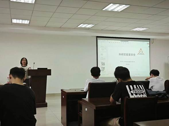 支部党员任小平老师面向全体研究生新生开展科研实验室安全讲座,通过列举实验室事故案例,向同学们讲解了实验室用水、用电、化学试剂、设备操作等安全注意事项。