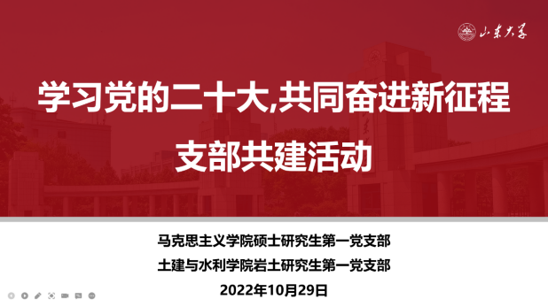 为组织广大学生党员深入习党的二十大精神,马克思主义学院硕士研究生第一党支部充分发挥马理论研究生党员的独特优势,积极与控制科学与工程学院、体育学院、材料科学与工程学院、齐鲁交通学院、土建与水利学院、物理学院等学院的研究生党支部共同开展“喜迎党的二十大,奋进山大新征程”联学共建系列活动。