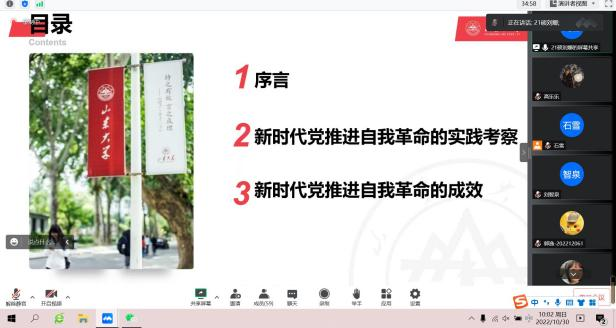10月30日,马克思主义学院硕士研究生第一党支部与物理学院2021级、2022级研究生党支部线上开展联学共建活动。物理学院2021级研究生党支部书记石雪主持活动。马克思主义学院硕士研究生第一党支部刘娜、仇鹤锡、郑文晶作了题为“新时代中国共产党自我革命的实践考察”的领学分享,带领大家学习了党的二十大报告中关于新时代中国共产党自我革命的相关内容,讲解了什么是自我革命、怎样开展自我革命,以及新时代中国共产党进行自我革命的光辉历程,让参与党员对加强党的建设有了更加清晰的认识。